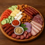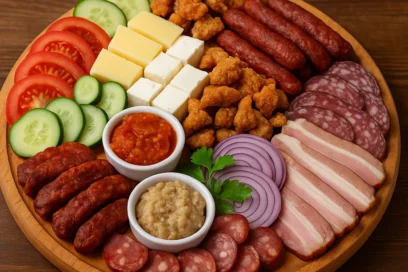 90 leiroșii 100gr, castraveți 100gr, brânză feta 150gr, cașcaval 150gr, jumări porc 100gr, cârnați măcelărești 150gr, salam crud-uscat 100gr, slănină afumată 150gr, zacuscă 100gr, salată vinete 100gr, ceapă roșie 50gr, masă totală 1,450kg