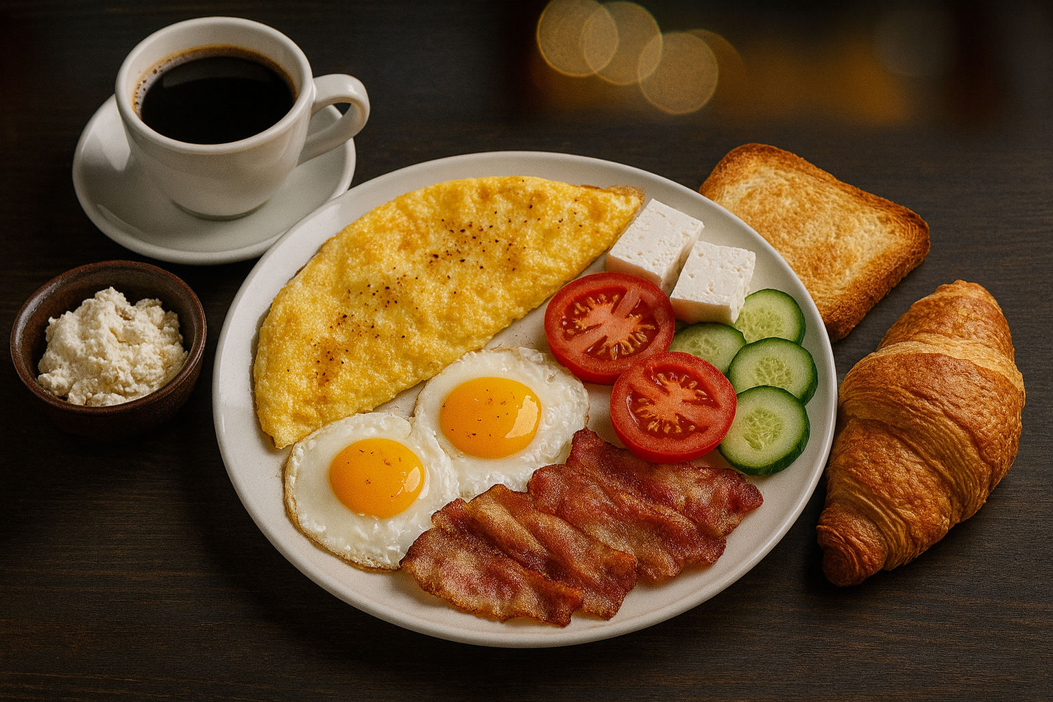 25 leiOuă 140gr, telemea de vacă 75gr, roșii 60gr, castraveți 70gr, bacon 50gr, pâine 30gr