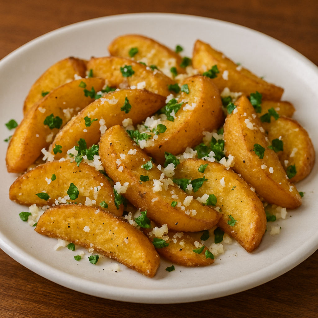 cartofi dippers 150gr, grana duro 20gr, usturoi 10gr, pătrunjel 5gr