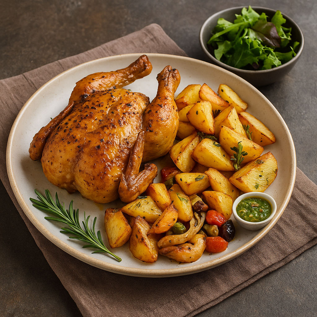 Cocoșel pitic 600gr, cartofi 150gr, rozmarin 5gr, sare 2gr, piper 1gr, mix salată 30gr, sos usturoi (usturoi, sos maioneză, pătrunjel, lămâie, sare, piper)