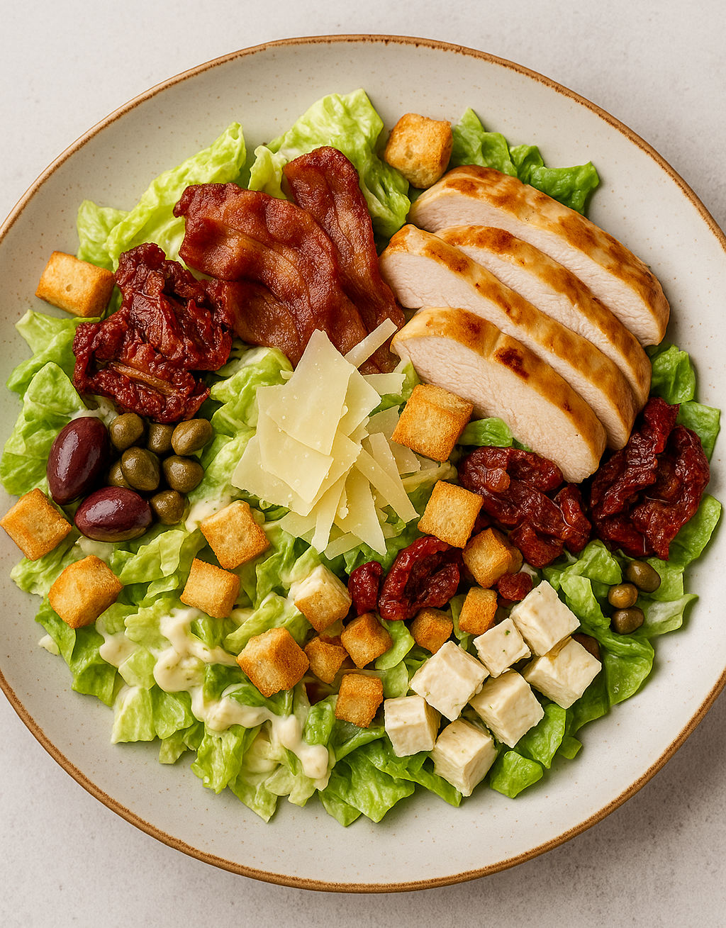 Piept de pui 100gr, salată iceberg 150gr, bacon 40gr, grana duro 10gr, sos Caesar 50gr