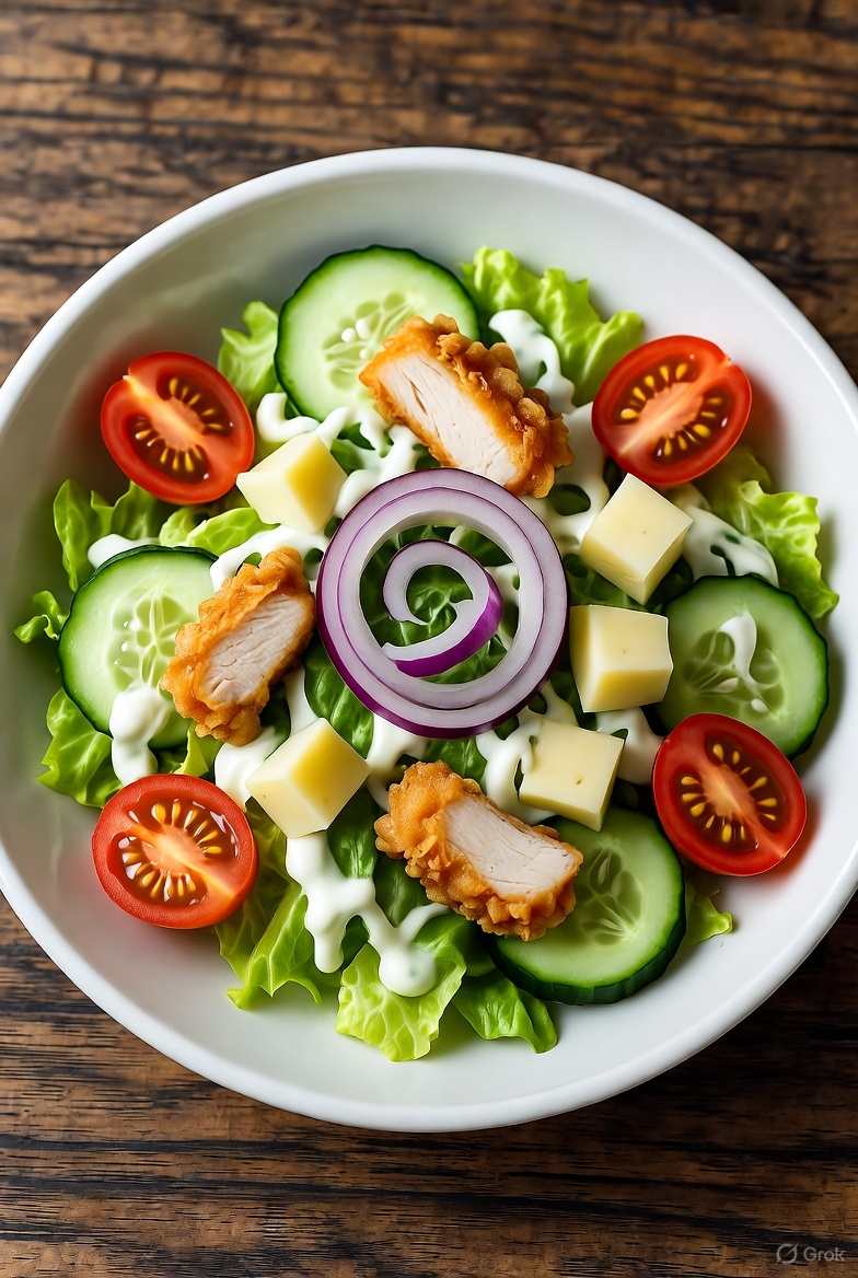 Piept de pui 100gr, făină tempura 20gr, salată iceberg 150gr, roșii cherry 30gr, castraveți 50gr, ceapă roșie 20gr, grana duro 20gr, sos remoulade 30gr