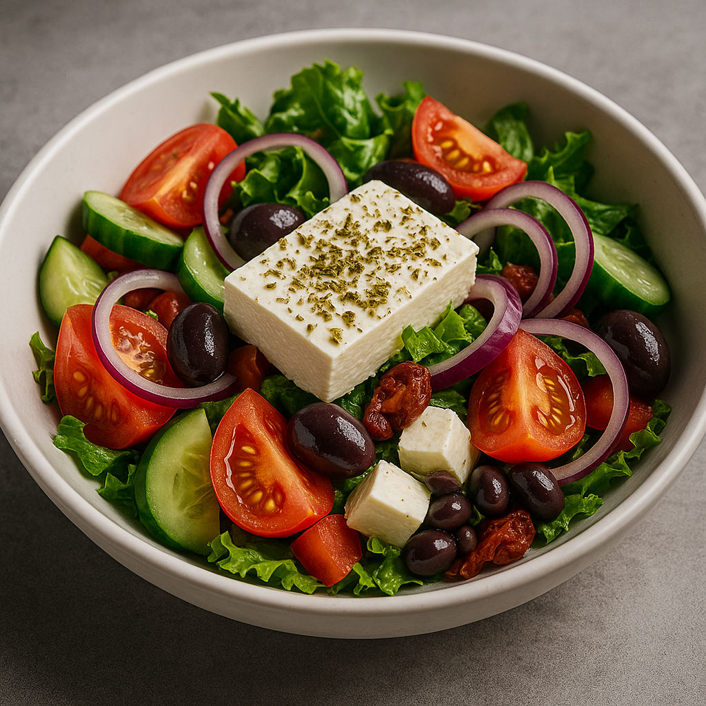 Roșii 100gr, castraveți 100gr, mix salată 30gr, ceapă roșie 20gr, brânză feta 70gr, măsline kalamata 30gr, ulei măsline 5ml, oregano 2gr