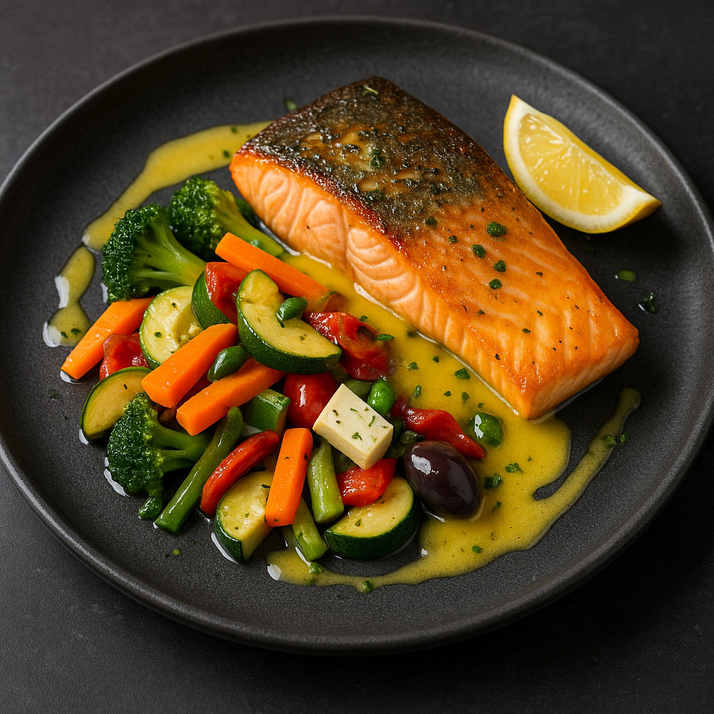 File somon 200gr, baby morcov 100gr, broccoli 100gr, sos de lămâie cu unt 50ml, sare 2gr, piper 1gr